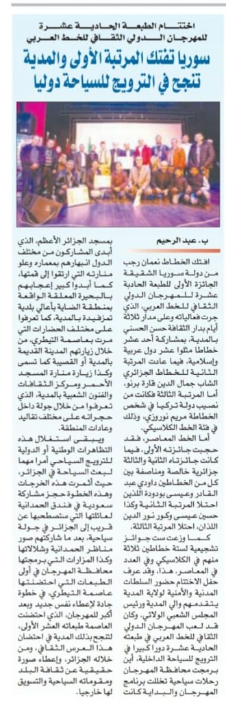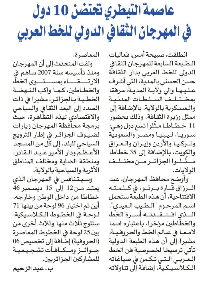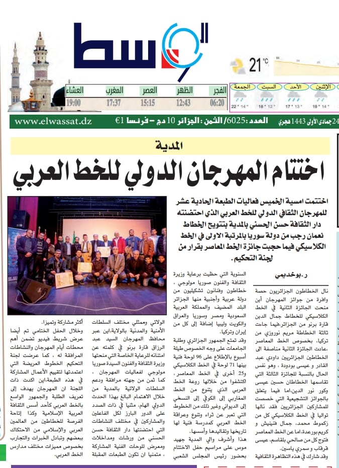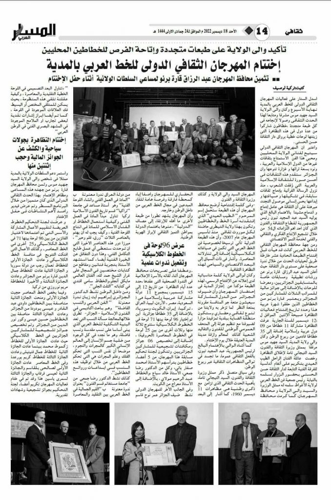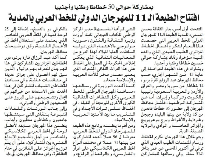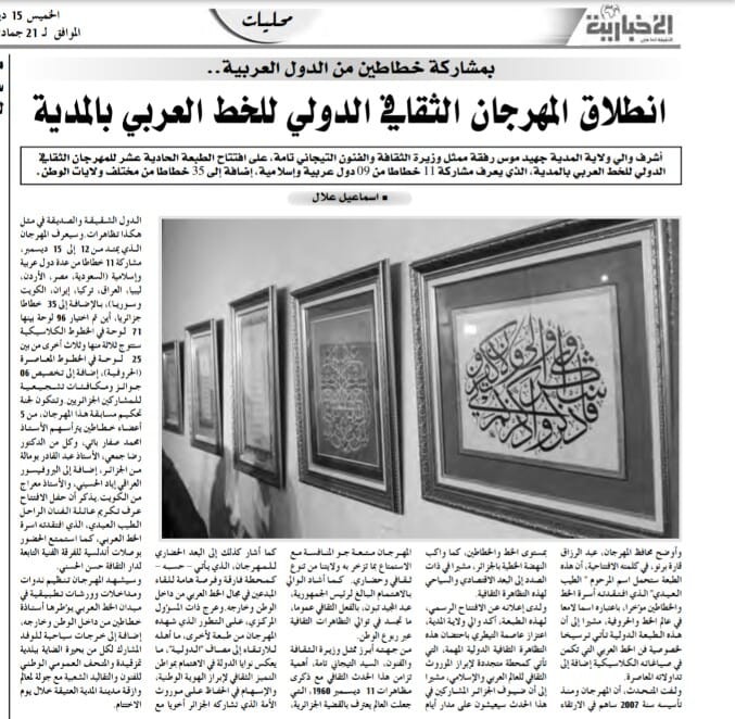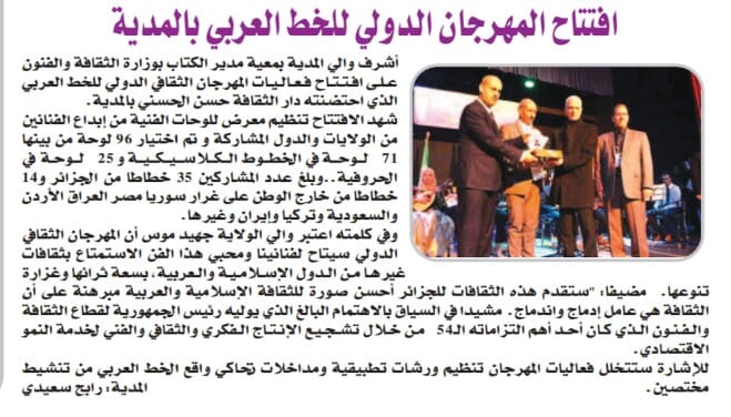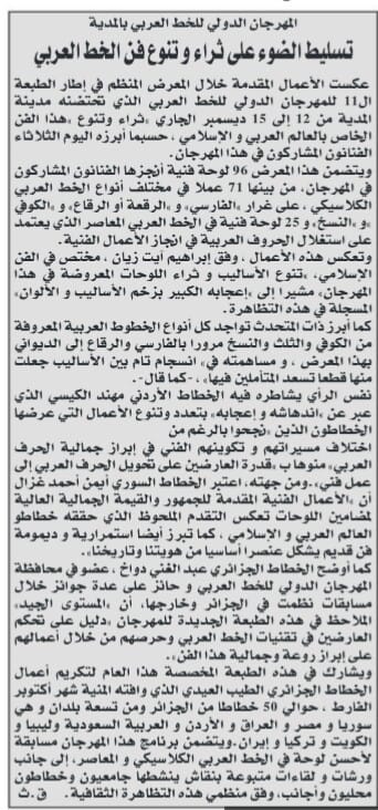 إلى جانب الفعاليات الفنية المميزة، حظي المهرجان الدولي للخط العربي بتغطية إعلامية واسعة، حيث نشرت العديد من الصحف مقالات تسلط الضوء على إبداعات الفنانين المشاركين وأهمية هذا الحدث الثقافي. تعكس هذه المنشورات الصحفية اهتمام وسائل الإعلام بجماليات الخط العربي ودورها في تعزيز الهوية الثقافية.